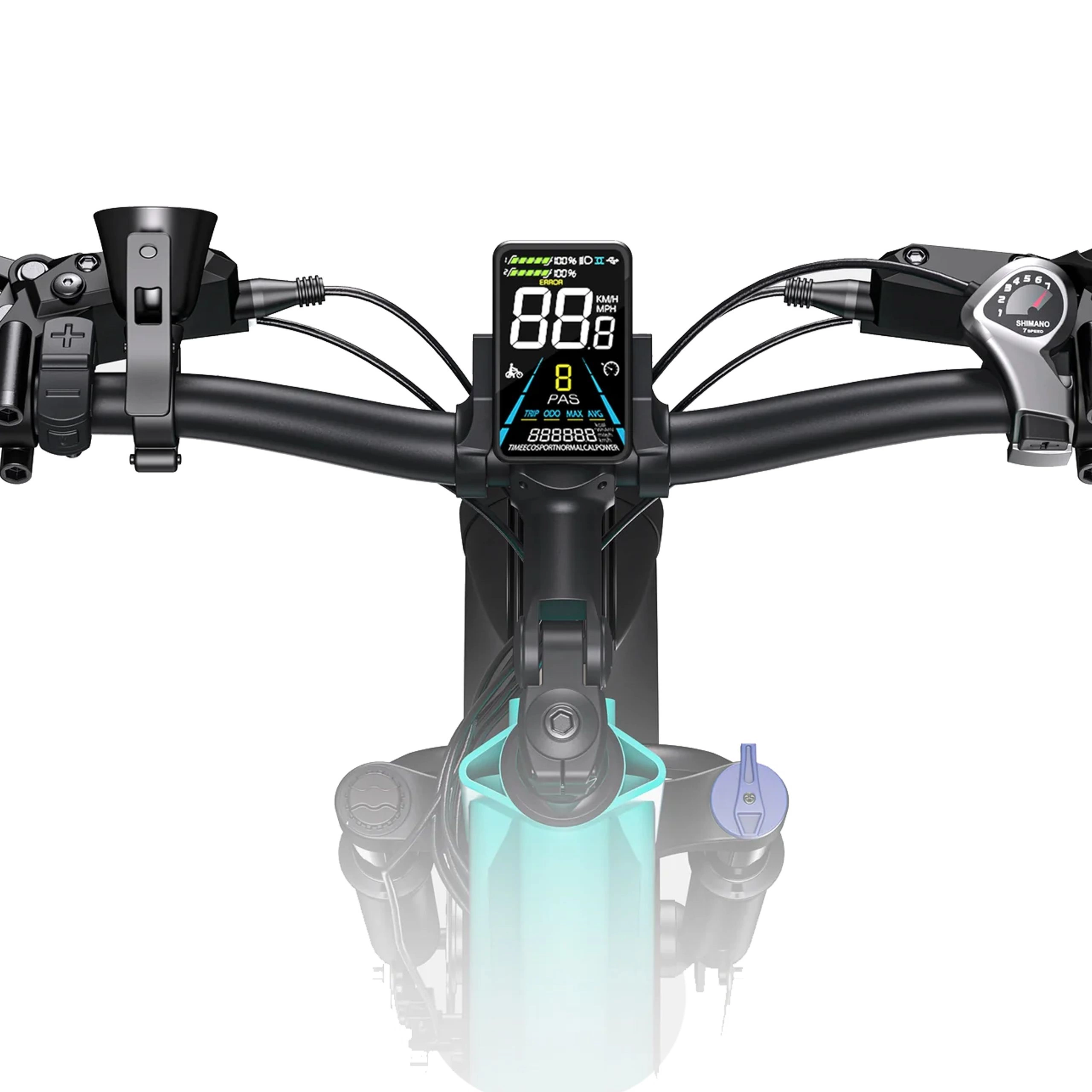 The advanced LCD display provides real-time data on battery status, speed, distance, power output, and riding time, along with error detection and lighting controls for a safer and more informed ride.