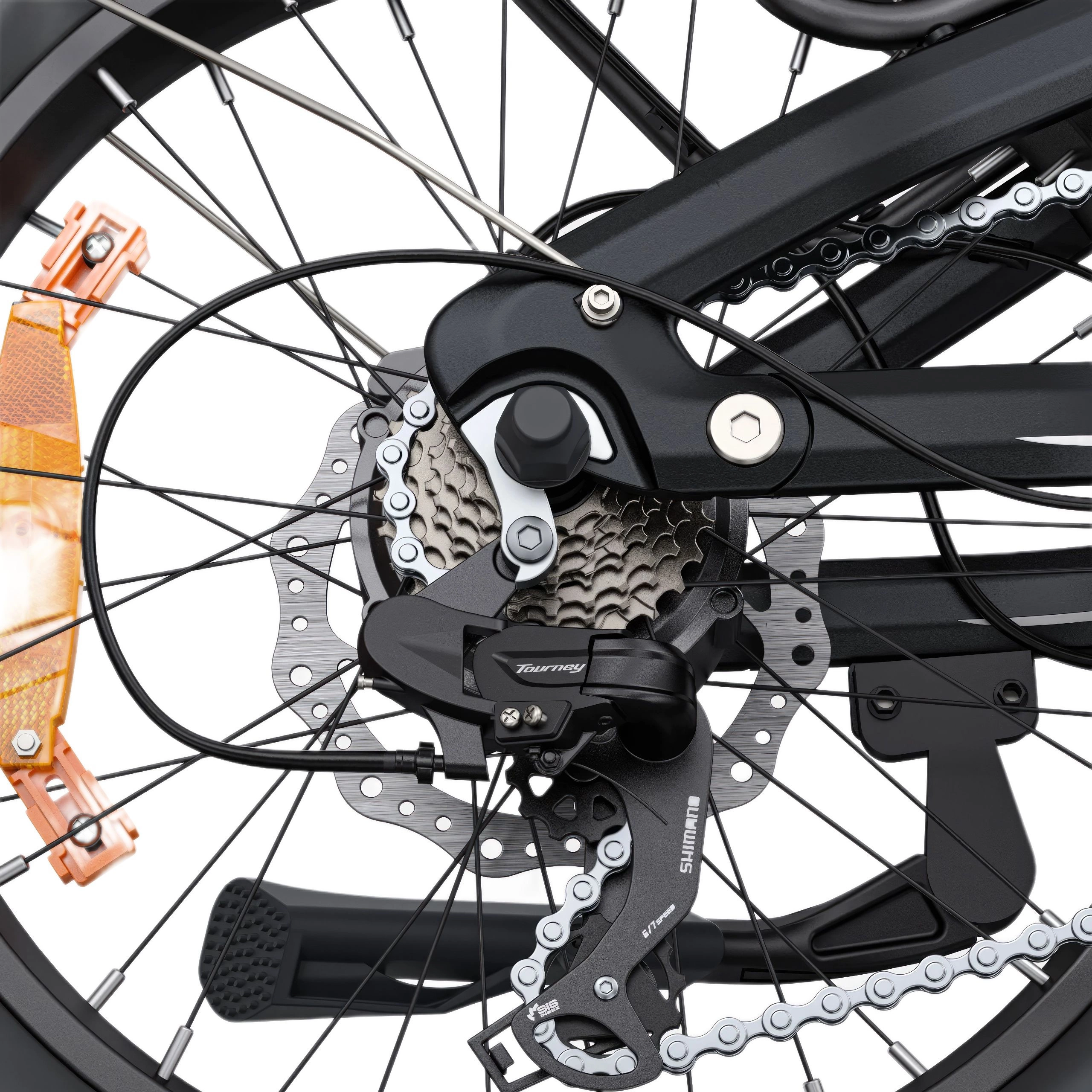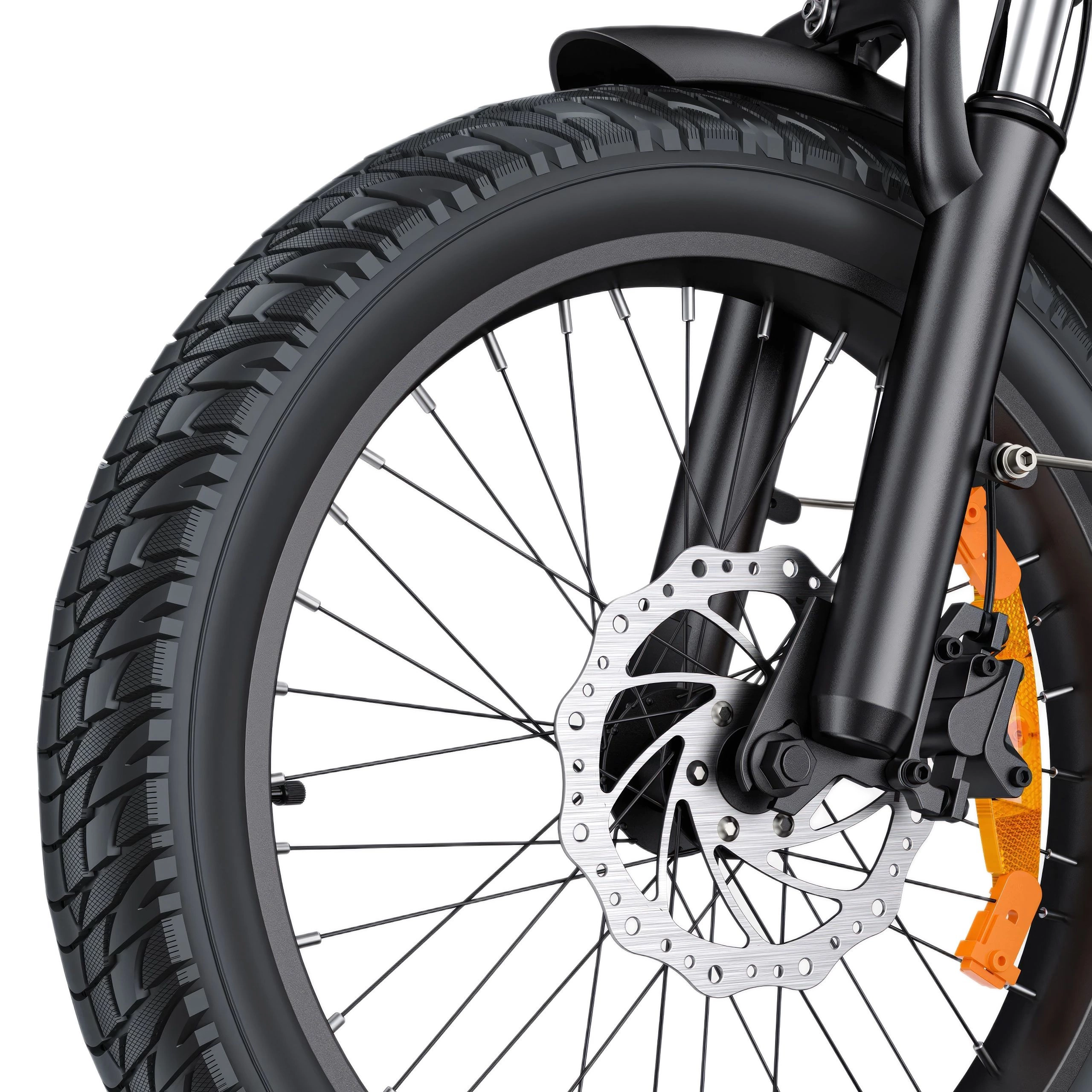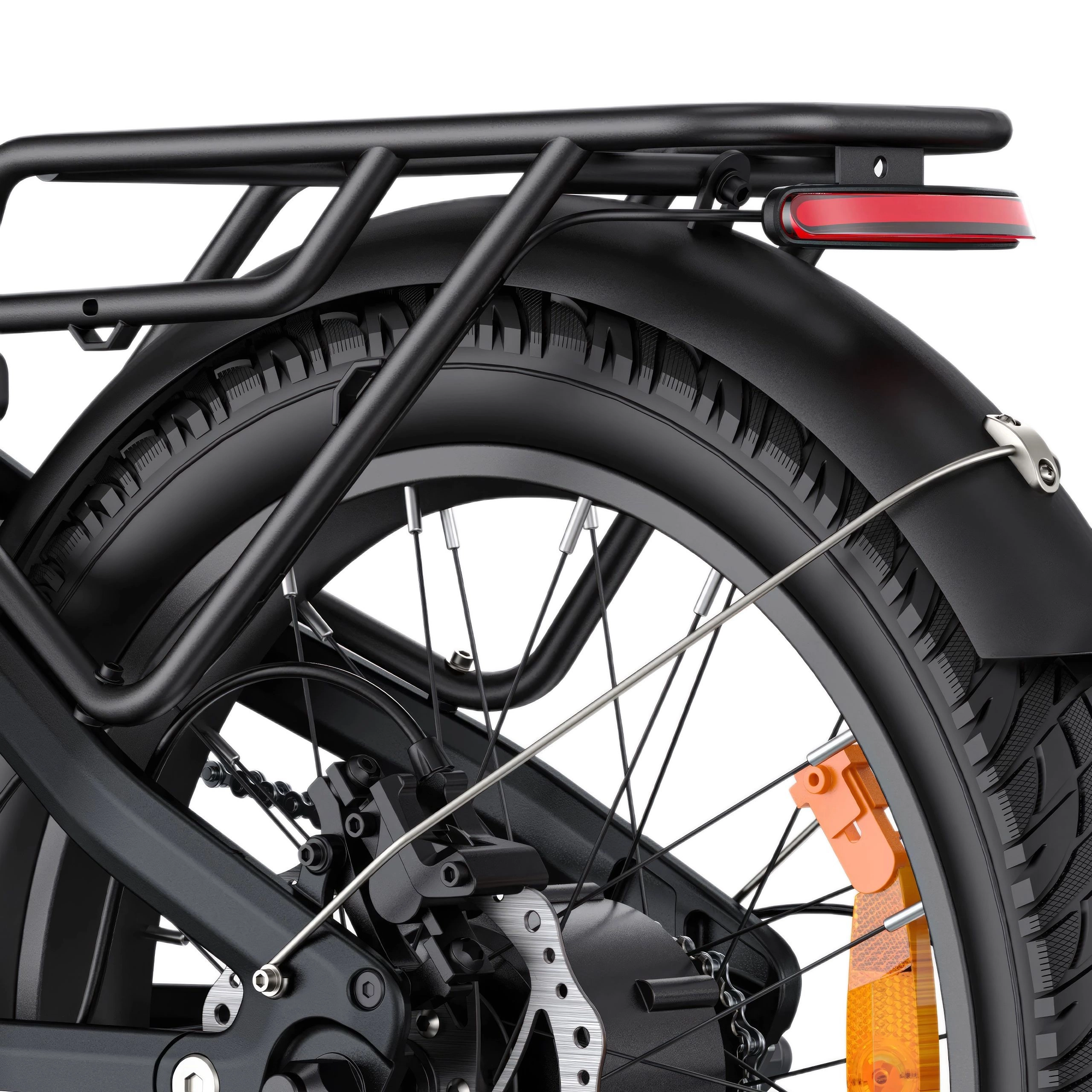 The 20” × 3.0” hybrid urban tyres include a 3 mm puncture-resistant layer for comfort, grip, and durability. Their substantial width provides stability on loose surfaces, while the puncture protection reduces the likelihood of flat tyres.
