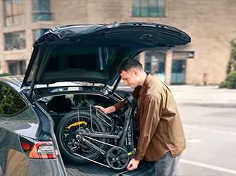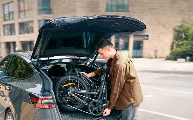 The thoughtfully engineered folding mechanism compacts the bike to just 39×20×30 inches (100×51×75 cm). It occupies less than 0.3 cubic metres of space.