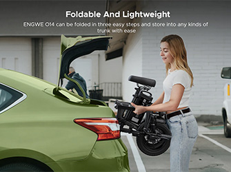 The ENGWE O14 electric bike weighs only 59 lbs (26.9 kg). It’s easy to carry and store. Its foldable design allows it to be compacted to dimensions of 75x35x64 cm, making it perfect for transport in a car boot or storing in small spaces.