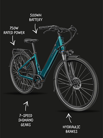 500W motor paired with a 499.2Wh battery delivers up to 56 mi (90 km) of range in ECO mode, letting you ride for days between charges.