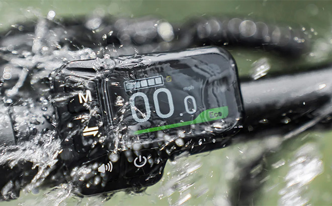 The backlit 1.47-inch LCD display remains visible in all lighting conditions. The control buttons are positioned for easy thumb access while keeping your hands on the handlebars for safety.