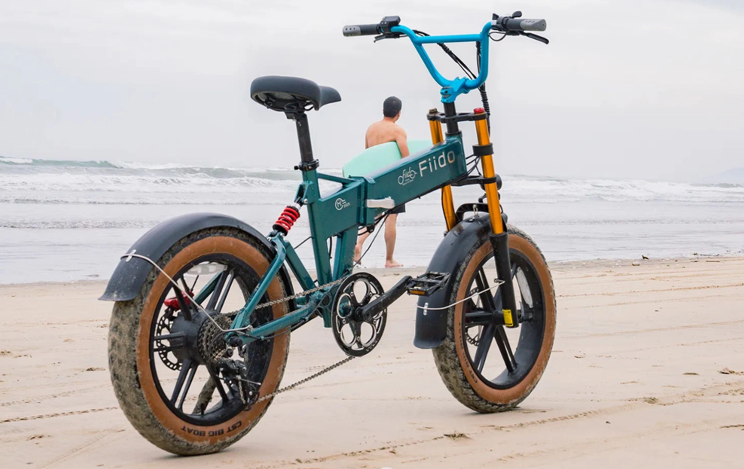 The Fiido M1 Pro electric bike has a bright teal blue frame with gold front forks. The wide tyres have tan sides like classic off-road vehicles, matching the bike's adventure style. The bike has strong BMX-style handlebars and black fenders to keep sand and water off the rider.