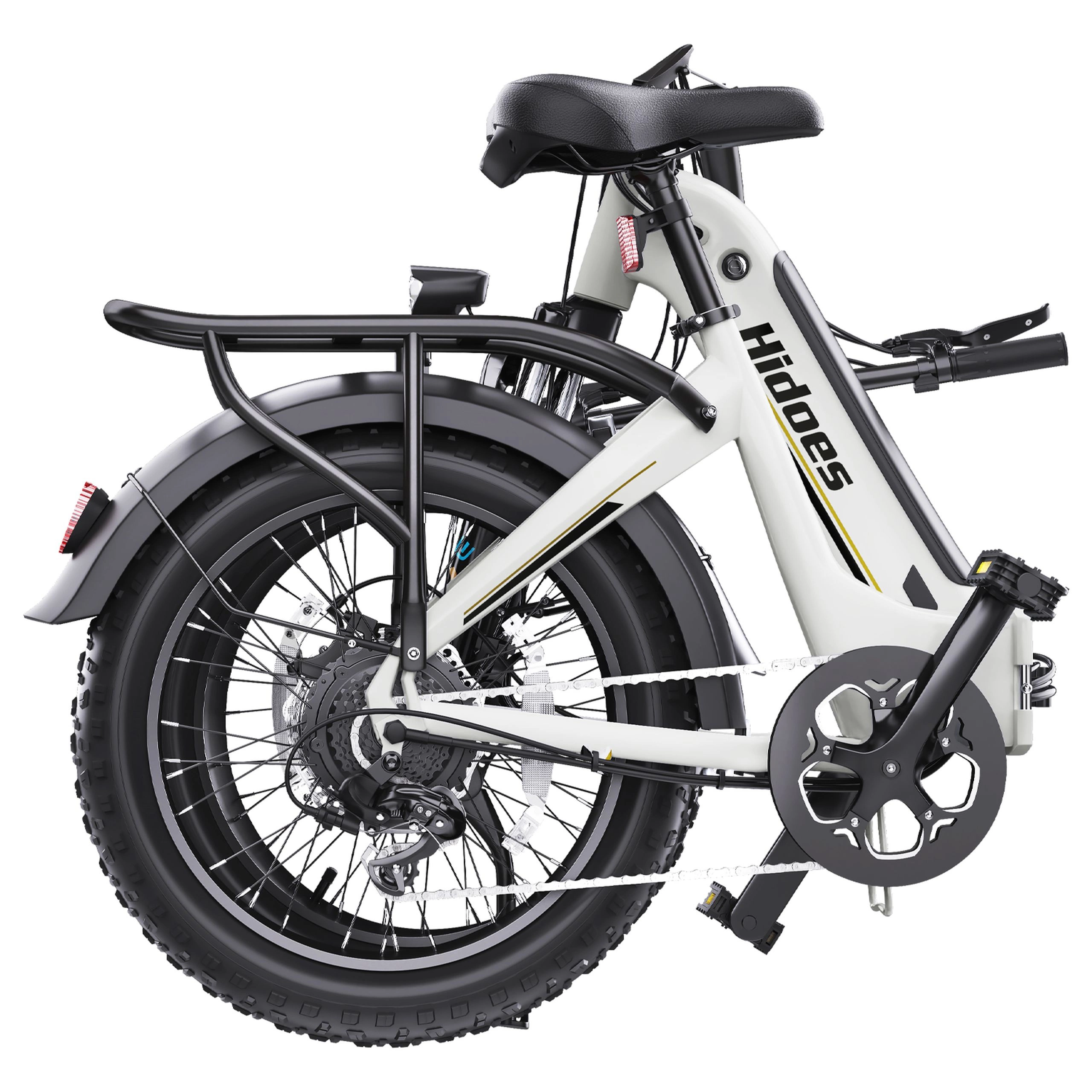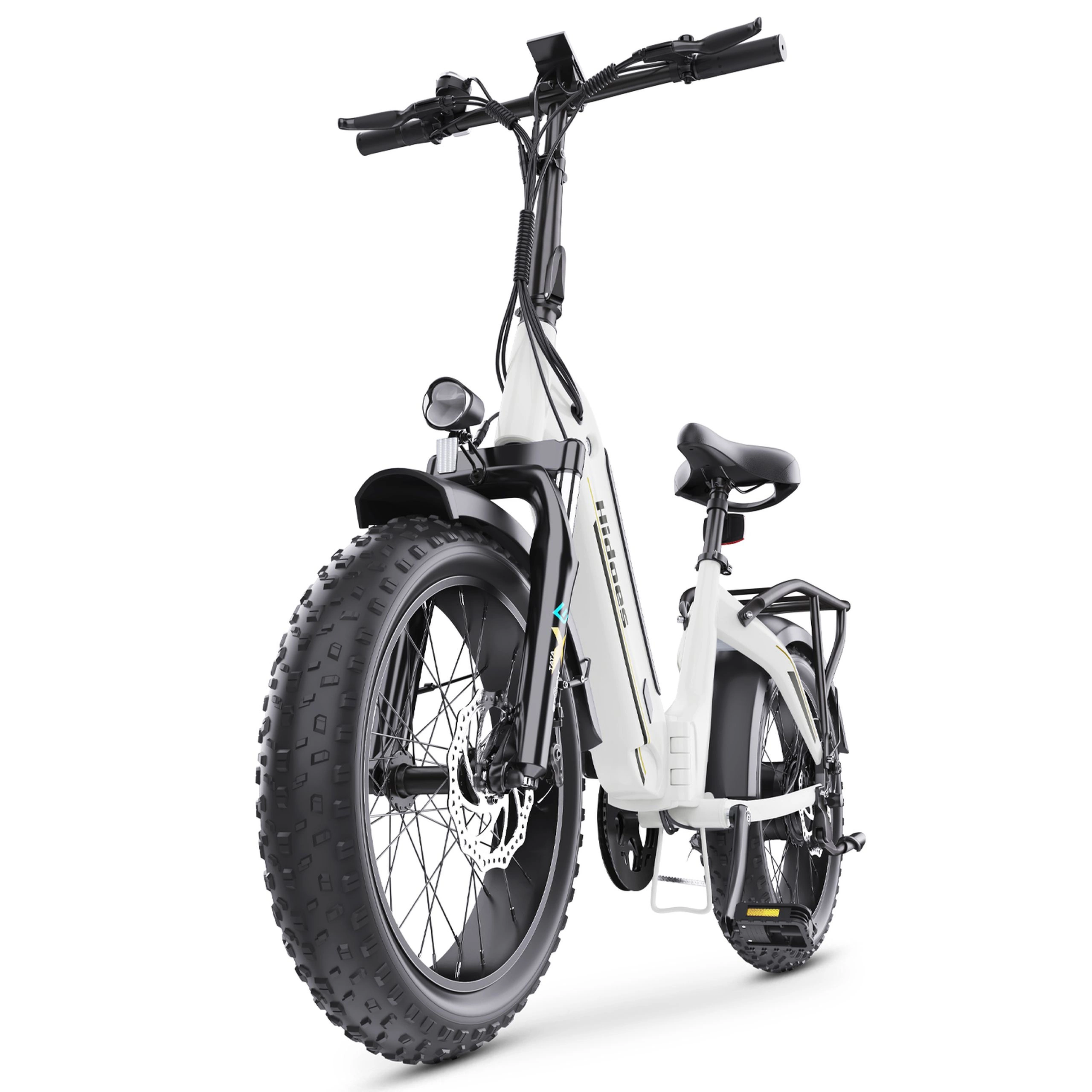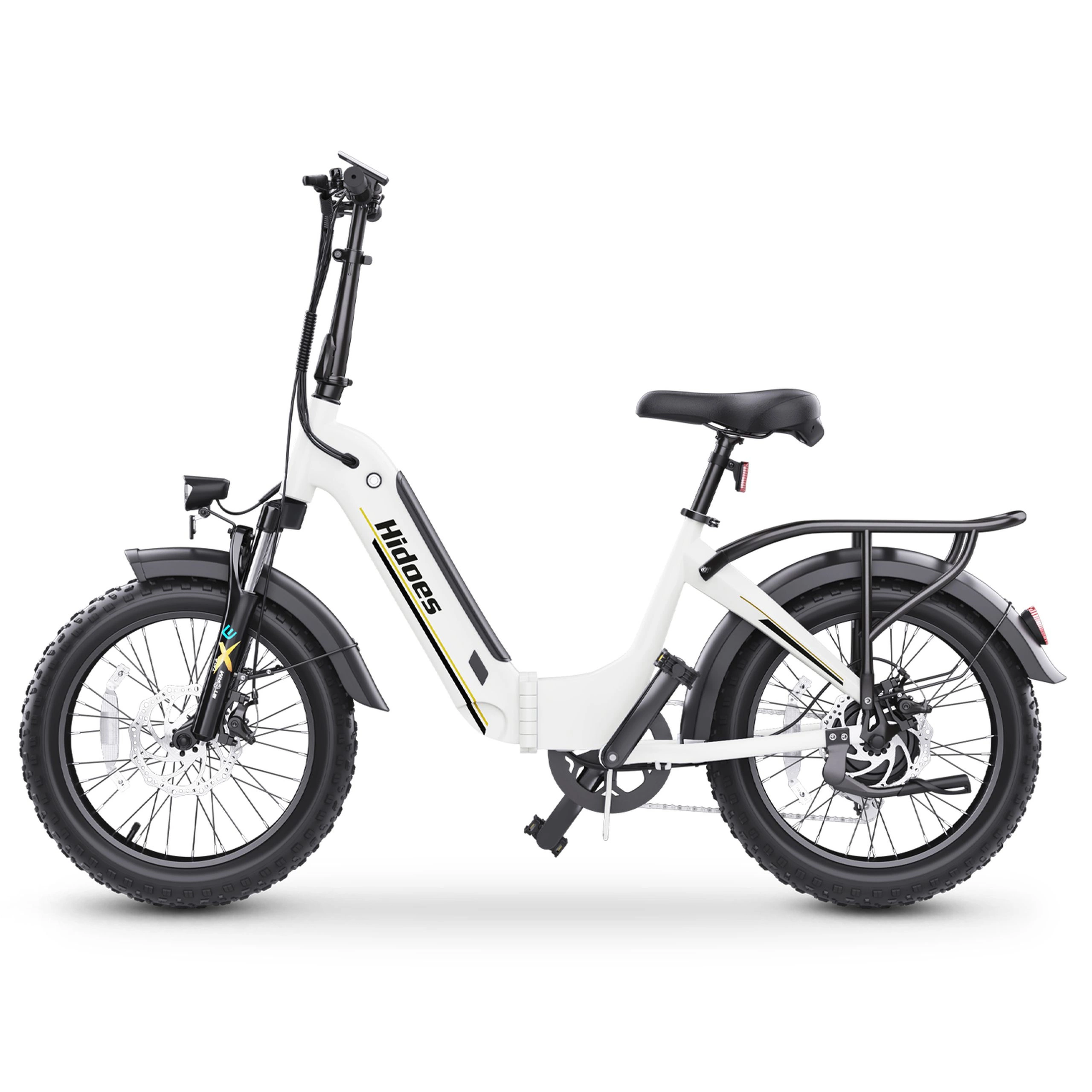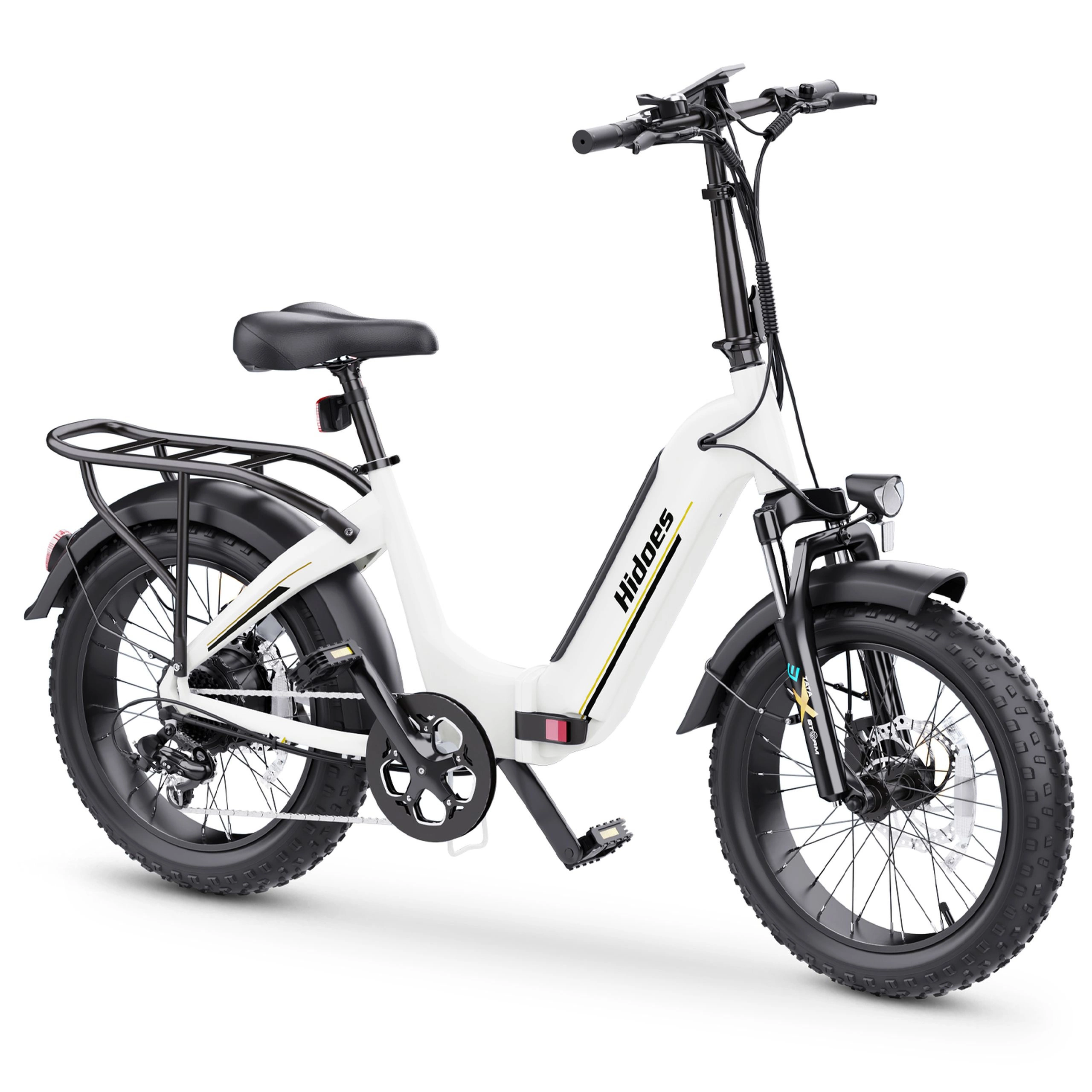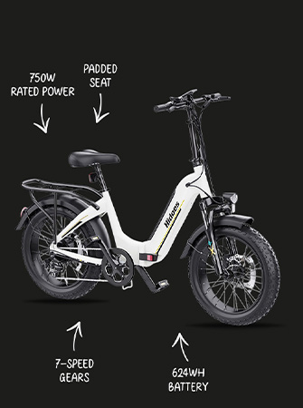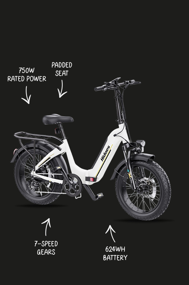 The Hidoes BF1’s hydraulic front fork absorbs impacts from bumps, potholes, and rough terrain. The fat tyres soak up small bumps and vibrations. But that’s not all: the seat provides adequate padding for moderate-length rides, while the upright riding position reduces strain on your back and wrists. For cargo, the included rear rack adds versatility, letting you carry bags, packages, or other items securely attached to the bike.
