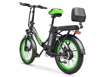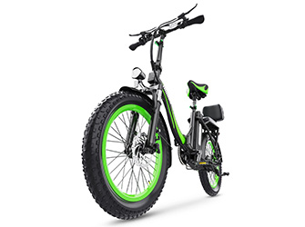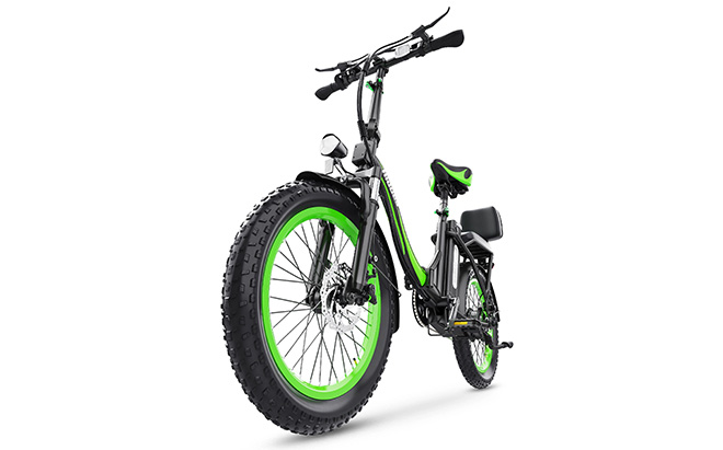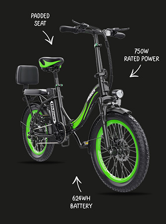 The front fork suspension and seat post shock absorber work together to reduce jolts from bumps and rough roads, while 20” × 3.0” fat tyres add stability.