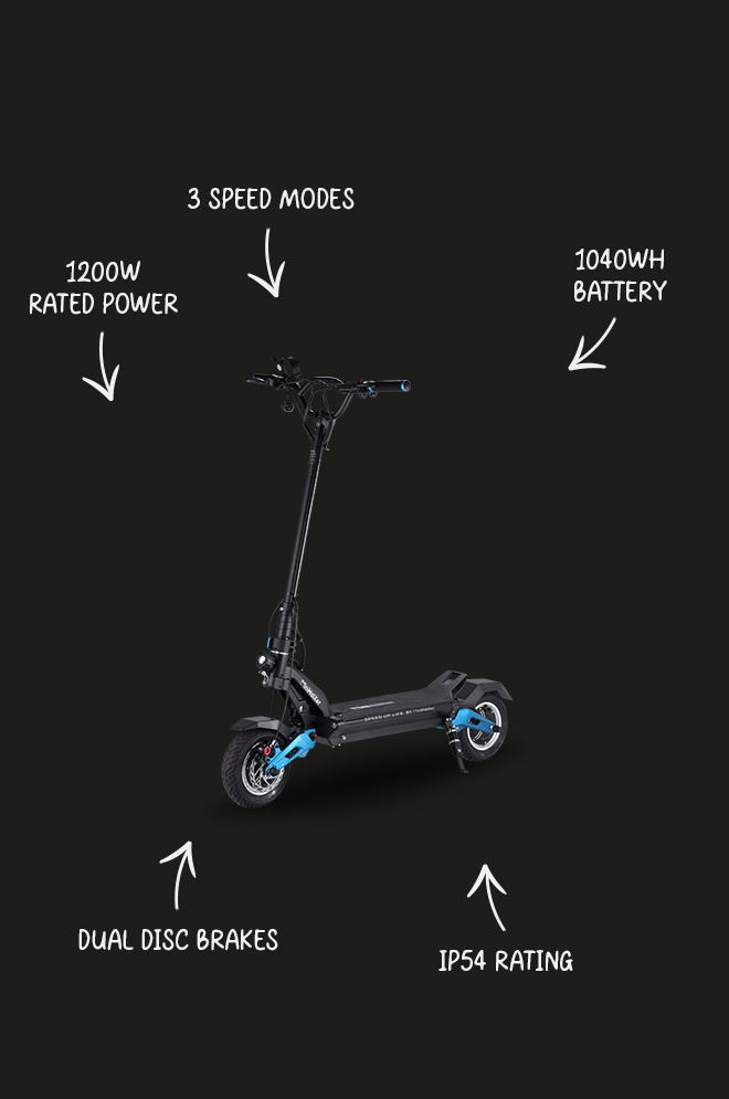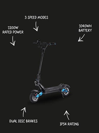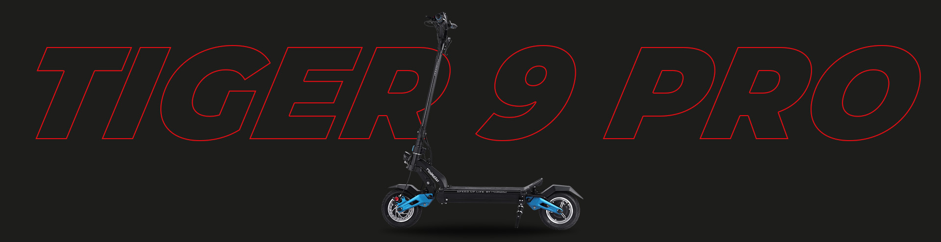 The Tiger 9 Pro electric scooter features dual 1000W hub motors generating a combined 2400W of peak power.