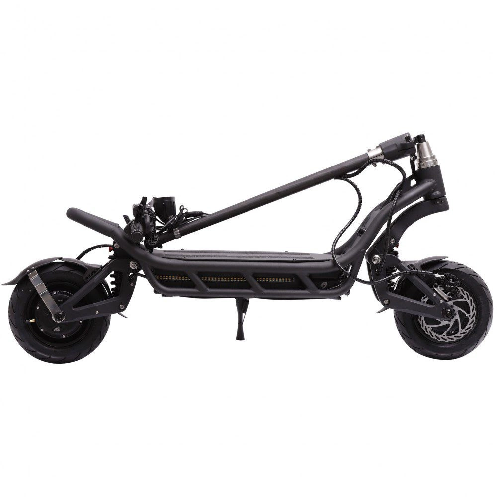 The electric scooter offers whisper-quiet performance without sacrificing power thanks to 50A sinewave controllers. Two 165mm adjustable hydraulic coil suspensions and 11-inch tubeless tyres ride smoothly on any terrain. The intensely bright 2000 Lumen front light provide a clear path in low-light conditions. The high-quality motorcycle-inspired horn ensures you’re heard when you need to be. Extra-wide handlebars are extremely comfortable for long rides. If you’re tall—this is a bonus point for you.