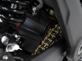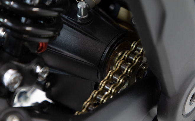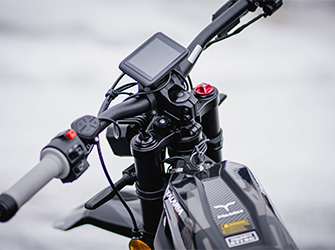Telescopic forks up front and a Fastace monoshock with linkage at the rear provide excellent suspension control. The 19-inch spoke wheels (70/100 front, 80/100 rear) with CST tyres offer great grip, while 8-inch (203 mm) brake discs with 4-piston callipers ensure strong stopping power. The motor's centre frame mounting position ensures optimal weight distribution.